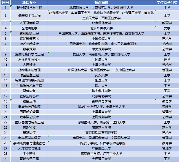 這也是近3年來(lái)新增本科專業(yè)較多的一次。記者梳理發(fā)現(xiàn),29種新專業(yè)涉及19個(gè)大類,其中交叉工程類、醫(yī)學(xué)技術(shù)類、戲劇與影視學(xué)類較多。