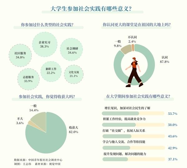 參與實(shí)地調(diào)研,開展支教服務(wù),進(jìn)入企業(yè)實(shí)習(xí)……這個(gè)夏天,不少大學(xué)生選擇用社會(huì)實(shí)踐作為暑假的打開方式。日前,中國青年報(bào)社社會(huì)調(diào)查中心聯(lián)合問卷網(wǎng)(wenjuan.com)發(fā)布的一項(xiàng)有1000名大學(xué)生參與的調(diào)查顯示,82.0%的受訪大學(xué)生認(rèn)為參加暑期社會(huì)實(shí)踐收獲大。對(duì)于參加社會(huì)實(shí)踐的意義,53.7%的受訪大學(xué)生認(rèn)為能增長(zhǎng)見識(shí),加深對(duì)社會(huì)民生的了解,50.0%的受訪大學(xué)生認(rèn)為能積累工作經(jīng)驗(yàn),提高就業(yè)競(jìng)爭(zhēng)力。87.8%的受訪大學(xué)生認(rèn)同,更大的課堂是在祖國的大地上。