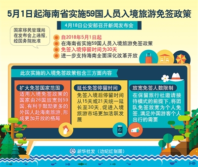 “擴大免簽國范圍;延長免簽停留時間;放寬免簽人數(shù)限制?!?月18日,公安部在京召開新聞發(fā)布會,國家移民管理局在發(fā)布會上通報:經(jīng)國務院批準,自2018年5月1日起,在海南省實施59國人員入境旅游免簽政策,進一步支持海南全面深化改革開放。