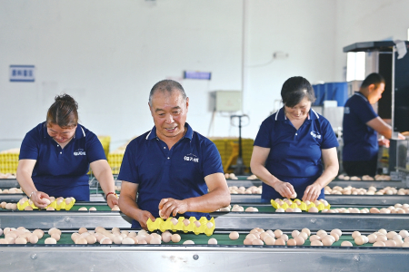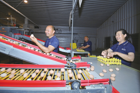 雞蛋通過自動分級機流向預先設定規(guī)格標準的生產線,工作人員再將大小一致的雞蛋收集碼盤。