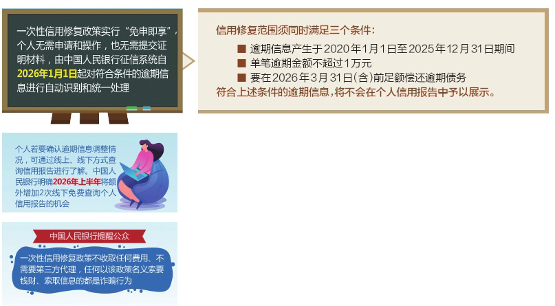在進行必要的技術準備后,中國人民銀行于22日明確發(fā)布一次性信用修復政策有關安排。自2026年1月1日起征信中心將根據(jù)不同還款情形完成自動調整,相關逾期記錄不再在個人信用報告中展示。