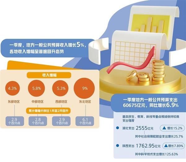 一季度,地方一般公共預(yù)算支出60675億元,同比增長6.9%。各地普遍在基本民生、教育、科技等重點領(lǐng)域保持較高支出強度。比如,湖北一季度地方一般公共預(yù)算支出2555億元,增長15.2%,其中社會保障和就業(yè)支出增長25.7%。陜西一季度一般公共預(yù)算支出1762.95億元,增長7.89%,其中科學(xué)技術(shù)支出增長125.63%。“各地財政支出繼續(xù)保持較快增長,衛(wèi)生、社保、科技和農(nóng)林水支出增速加快,財政公共服務(wù)和保障能力不斷增強?!奔质∝斦茖W(xué)研究所所長張依群表示。