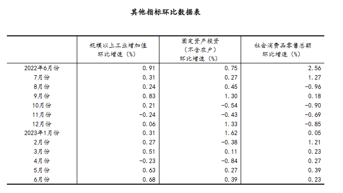 (2)根據(jù)季節(jié)調(diào)整模型自動(dòng)修正結(jié)果,對(duì)近一年來(lái)各期國(guó)內(nèi)生產(chǎn)總值、規(guī)模以上工業(yè)增加值、固定資產(chǎn)投資(不含農(nóng)戶)、社會(huì)消費(fèi)品零售總額環(huán)比增速進(jìn)行修訂。修訂結(jié)果及2023年二季度GDP環(huán)比數(shù)據(jù)、2023年6月份其他指標(biāo)環(huán)比數(shù)據(jù)如下: