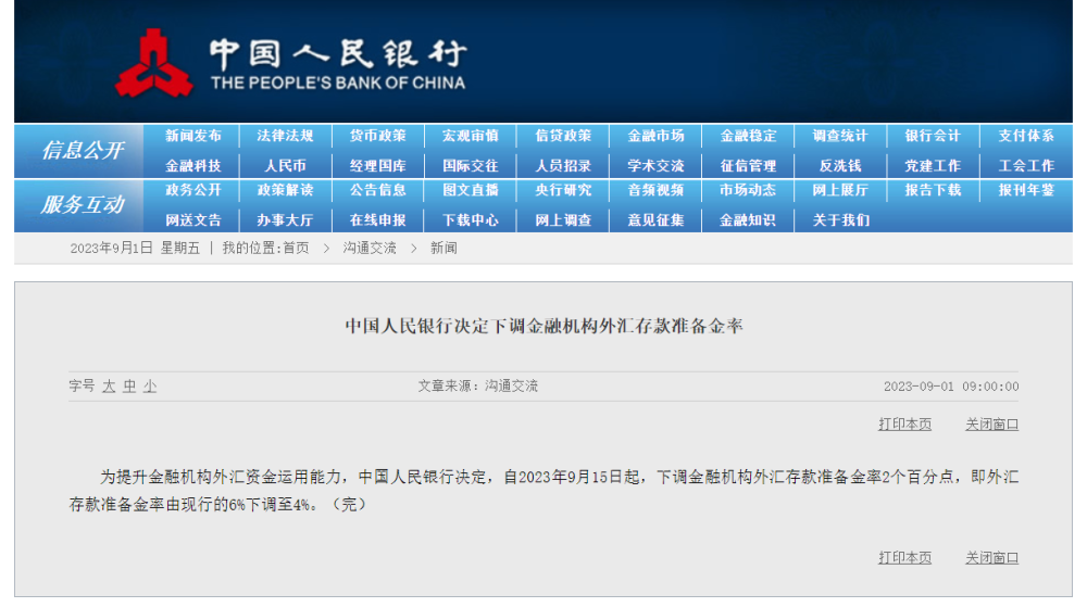 為提升金融機(jī)構(gòu)外匯資金運用能力,中國人民銀行決定,自2023年9月15日起,下調(diào)金融機(jī)構(gòu)外匯存款準(zhǔn)備金率2個百分點,即外匯存款準(zhǔn)備金率由現(xiàn)行的6%下調(diào)至4%。
