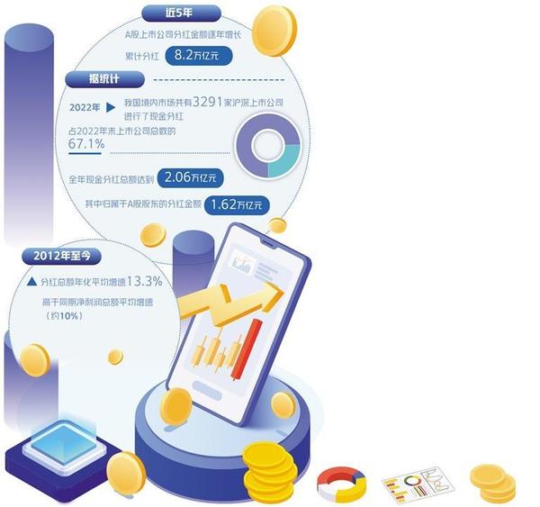 近5年,A股上市公司分紅金額逐年增長,累計分紅8.2萬億元。據(jù)統(tǒng)計,2022年,我國境內(nèi)市場共有3291家滬深上市公司進行了現(xiàn)金分紅,占2022年末上市公司總數(shù)的67.1%,全年現(xiàn)金分紅總額達到2.06萬億元,其中歸屬于A股股東的分紅金額1.62萬億元。國際比較來看,境內(nèi)市場分紅上市公司數(shù)量在全球主要證券市場中位居第一,現(xiàn)金分紅總額位列全球第二,分紅家數(shù)占比位列全球第二。此外,有163家上市公司公布2023年半年報現(xiàn)金分紅預(yù)案,預(yù)計分紅2030.1億元。