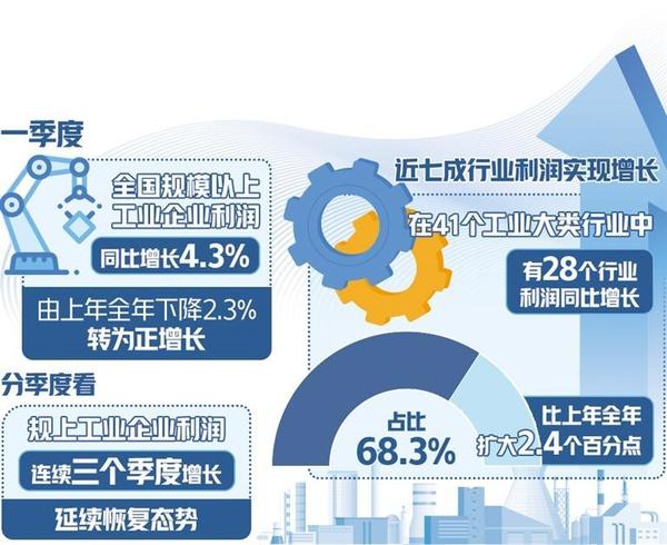 近七成行業(yè)利潤實現(xiàn)增長。一季度,在41個工業(yè)大類行業(yè)中,有28個行業(yè)利潤同比增長,占68.3%,比上年全年擴大2.4個百分點。分門類看,制造業(yè)利潤由上年全年下降2.0%轉(zhuǎn)為增長7.9%;采礦業(yè)利潤下降18.5%,降幅比上年全年收窄1.2個百分點;電力熱力燃氣及水生產(chǎn)和供應(yīng)業(yè)利潤增長40.0%,保持快速增長態(tài)勢。