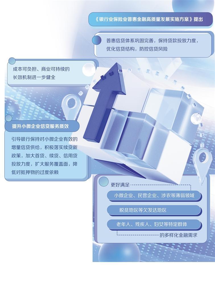 近年來,我國普惠金融發(fā)展取得長足進(jìn)步,金融服務(wù)的普惠性不斷提升。近期印發(fā)的《銀行業(yè)保險(xiǎn)業(yè)普惠金融高質(zhì)量發(fā)展實(shí)施方案》(以下簡稱《實(shí)施方案》)在主要目標(biāo)中提出,普惠信貸體系鞏固完善,保持貸款投放力度,優(yōu)化信貸結(jié)構(gòu),防控信貸風(fēng)險(xiǎn),成本可負(fù)擔(dān)、商業(yè)可持續(xù)的長效機(jī)制進(jìn)一步健全,更好滿足小微企業(yè)、民營企業(yè)、涉農(nóng)等薄弱領(lǐng)域,脫貧地區(qū)等欠發(fā)達(dá)地區(qū)以及老年人、殘疾人、婦女等特定群體的多樣化金融需求。