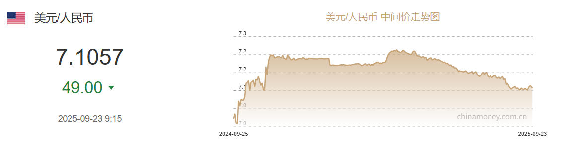 中新網(wǎng)9月23日電 據(jù)中國外匯交易中心網(wǎng)站消息,中國人民銀行授權(quán)中國外匯交易中心公布,2025年9月23日銀行間外匯市場人民幣匯率中間價為:1美元對人民幣7.1057元,上調(diào)49個基點。