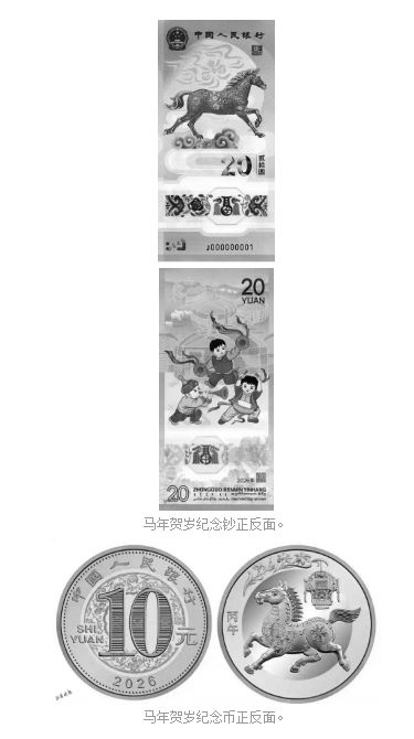 本次發(fā)行的2026年賀歲紀念幣面額10元,直徑27毫米,材質為雙色銅合金材質,發(fā)行數量1億枚,正面為面額和年份,背面以剪紙風格馬形象為主,輔以花燈和萱草圖案,壁面左側刊“丙午”字樣。紀念鈔面額20元,票面長145毫米,寬70毫米,采用塑料材質,發(fā)行量1億張,正面為馬造型主景,背面描繪兒童歡慶鑼鼓場景,同時融合傳統(tǒng)裝飾和多民族文字元素。二者均為我國法定貨幣,每人預約、兌換限額均為20張(枚)。