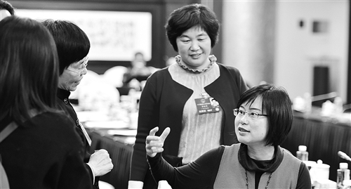 3月11日,人大廣東代表團(tuán)在駐地舉行分組會議。全國人大代表龍芳(右一)、李淑明(右二)與同團(tuán)代表在討論“一帶一路”戰(zhàn)略對廣東企業(yè)“走出去”產(chǎn)生的影響。本報(bào)記者 李景錄攝