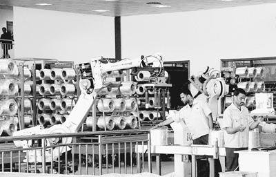 2015年,新蘇伊士運(yùn)河的開通拉動了埃及的制造業(yè)和基礎(chǔ)設(shè)施建設(shè)。圖為在北非最大的玻璃纖維制造企業(yè)埃及巨石公司,埃及員工與“機(jī)械手臂”一同生產(chǎn)的場景。王云松攝
