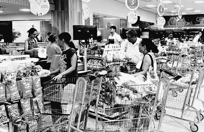 由于巴西通貨膨脹攀升導(dǎo)致消費不振,民眾購物更趨謹(jǐn)慎。圖為在里約熱內(nèi)盧一家超市,當(dāng)?shù)孛癖娫诓少徤畋匦杵贰S浾?顏 歡攝