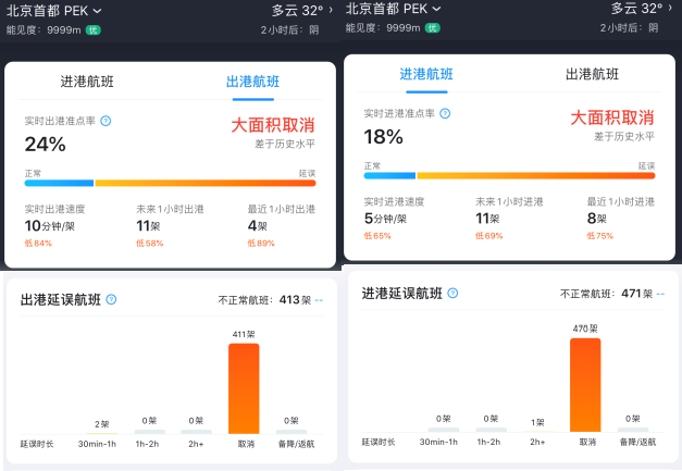 受各大航空公司退票處置方案的影響,航班大面積取消。飛常準數(shù)據(jù)顯示,截至6月22日15時15分,北京首都國際機場當日出港航班大面積取消,實時出港準點率僅為24%,413架不正常航班中有411架航班取消出港;同樣,當日入港航班大面積取消,實時入港準點率僅為18%,471架不正常航班中有470架航班取消入港。