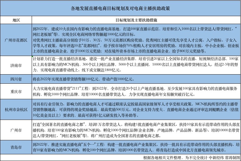 例如青島市提出,到2022年,推進(jìn)實(shí)施直播電商“五個(gè)一”工程,包括培訓(xùn)1000名帶貨達(dá)人等,將青島打造成中國北方直播電商領(lǐng)先城市。廣州市提出打造“全國著名的直播電商之都”,培訓(xùn)1萬名帶貨達(dá)人的口號(hào)。