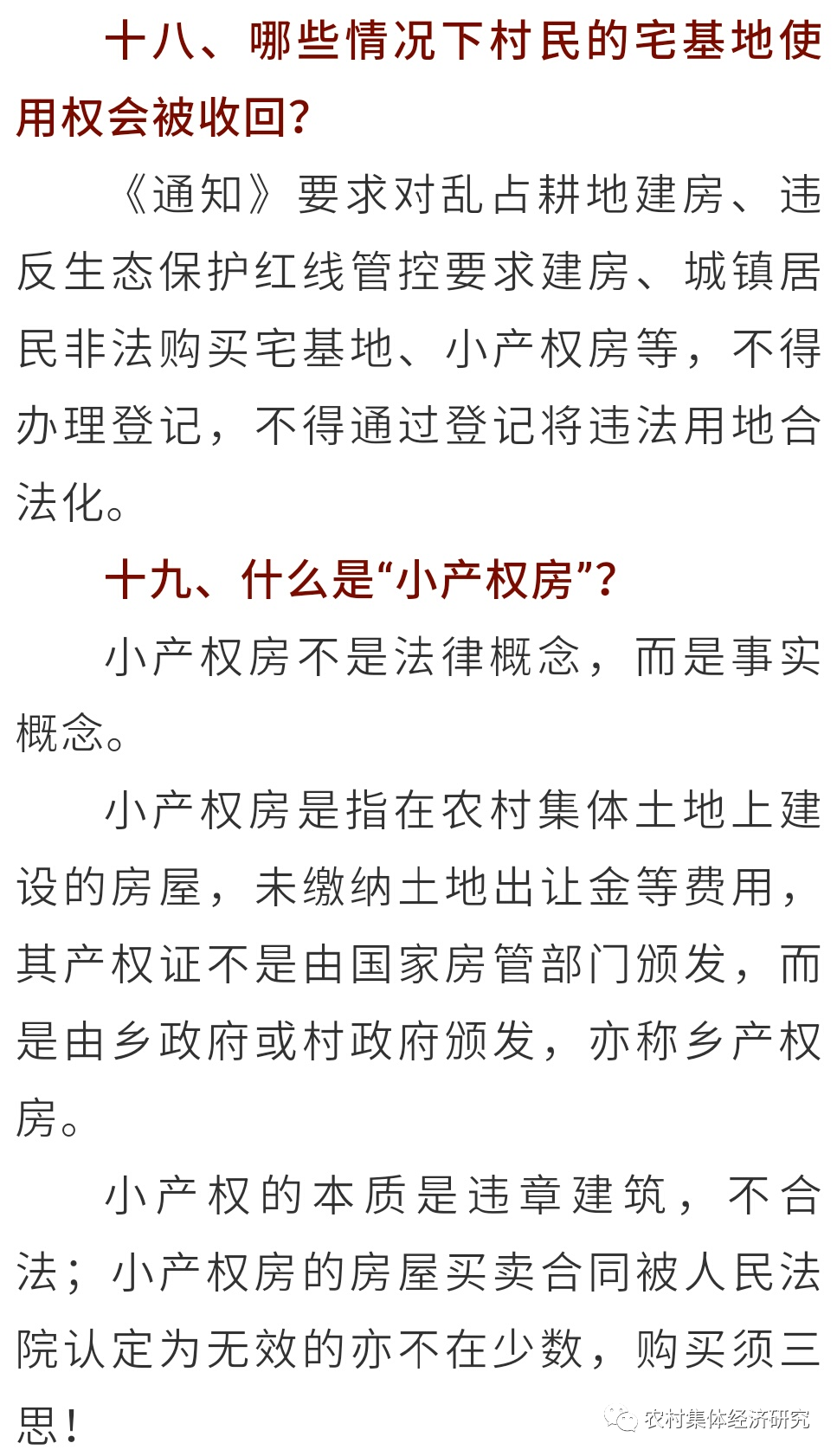 二十、城鎮(zhèn)居民能否到農(nóng)村購(gòu)置宅基地?不能,《通知》要求,嚴(yán)禁城鎮(zhèn)居民到農(nóng)村購(gòu)買宅基地,嚴(yán)禁下鄉(xiāng)利用宅基地建設(shè)別墅大院和私人會(huì)館,嚴(yán)禁借流轉(zhuǎn)之名違法違規(guī)圈占、買賣宅基地。