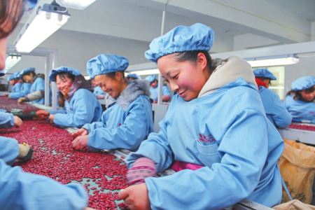 岢嵐有野生沙棘49萬畝。宋家溝功能食品有限公司是一家從事沙棘全產(chǎn)業(yè)鏈精深加工的開發(fā)企業(yè)?!笆袌錾仙臣R姡臣璨欢嘁?。”總經(jīng)理張艷峰介紹,其實早在1977年沙棘就入了藥典,藥用價值、食用價值非常高?,F(xiàn)在人們對健康養(yǎng)生非常重視,為此,公司組織科研力量進(jìn)行攻關(guān),成功開發(fā)出沙棘茶,廣受市場歡迎。“我們以每斤2元的價格從村民手里收購沙棘鮮葉,村民只要上趟山采摘,回來就能變成錢?!?/p>