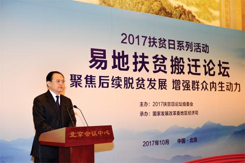 本次論壇以“聚焦后續(xù)脫貧發(fā)展,增強群眾內(nèi)生動力”為主題,是2017 年扶貧日系列活動之一。來自國家發(fā)改委、人力資源社會保障部、國土資源部、交通運輸部、水利部、農(nóng)業(yè)部、商務部、中國人民銀行、國家林業(yè)局、國家旅游局、銀監(jiān)會、國務院扶貧辦、全國工商聯(lián)、國家開發(fā)銀行、中國農(nóng)業(yè)發(fā)展銀行等部門和單位有關司局負責同志,全國22 個有易地扶貧搬遷任務的省份發(fā)展改革委負責同志以及部分省、市、縣從事易地扶貧搬遷工作的干部群眾,帶動搬遷群眾脫貧致富的部分龍頭企業(yè)代表,共約100 人參加了論壇。