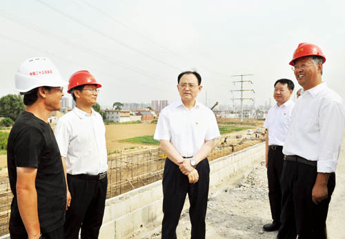 在忻州西站以北的大西客專與忻五公路交叉地段,京太鐵路(雄忻段)引入大西客專施工現(xiàn)場(chǎng),李俊明詳細(xì)了解大西客專既有線路、雄忻高鐵接軌的近期工程和預(yù)留遠(yuǎn)期規(guī)劃,實(shí)地察看左右進(jìn)出線的路基打樁、擋墻施工、路基幫寬等正在進(jìn)行的工程,聽取各主要節(jié)點(diǎn)工期計(jì)劃安排,詢問工程實(shí)施中的困難問題。