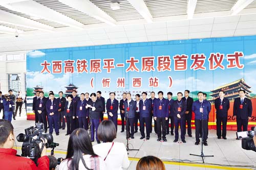 本報(bào)訊(記者楊峰雷 任逢春)9月28日11時57分,車廂標(biāo)有“魅力忻州心靈之舟”及五臺山標(biāo)志性古建大白塔圖案的D5363次“和諧號”動車組列車緩緩駛離忻州西站,這標(biāo)志著廣大群眾期盼已久的大西高鐵原平西至太原南段正式開通運(yùn)營,我市從此并入全國高速鐵路網(wǎng)絡(luò),邁入高鐵時代。高鐵開通首發(fā)儀式在忻州西站一站臺舉行,省人大常委會副主任、市委書記李俊明宣布高鐵開通并發(fā)出發(fā)車指令,市長鄭連生、太鐵集團(tuán)公司副總經(jīng)理劉楓分別致辭。市領(lǐng)導(dǎo)王珍、劉鋼柱、陳義青、王建廷、范晉昌、崔建新等出席首發(fā)儀式。市委常委、常務(wù)副市長趙志堅(jiān)主持首發(fā)儀式。