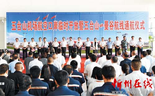 圖為五臺(tái)山機(jī)場(chǎng)航空口岸臨時(shí)開(kāi)放暨五臺(tái)山——曼谷航線通航儀式現(xiàn)場(chǎng)。