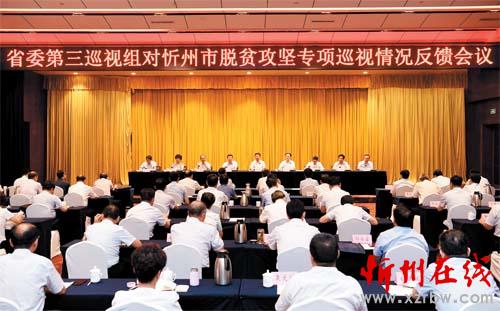 圖為省委第三巡視組對(duì)忻州市脫貧攻堅(jiān)專(zhuān)項(xiàng)巡視情況反饋會(huì)議會(huì)場(chǎng)。