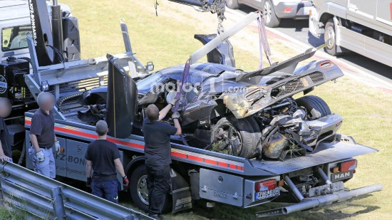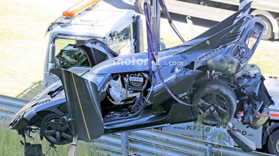 科尼塞克早上發(fā)布消息稱One:1打算在紐北刷新最快圈速紀錄。知情人表示,刷圈過程中,車輛在高速駛入Adenauer Forst彎時發(fā)生失控,車身撞跨賽道左側的護欄,進而飛入草地,事故令One:1車身損毀嚴重,前保險杠折斷、擋風玻璃破碎,尾部受損。