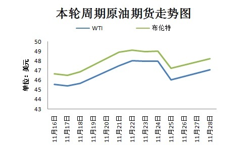 本輪計(jì)價(jià)周期內(nèi),國際原油價(jià)格呈現(xiàn)先漲后跌再漲態(tài)勢(shì)。截至11月28日收盤,當(dāng)日,美國WTI原油期貨漲1.02美元,報(bào)收47.08美元/桶;布倫特原油期貨漲1.00美元,報(bào)收48.24美元/桶。