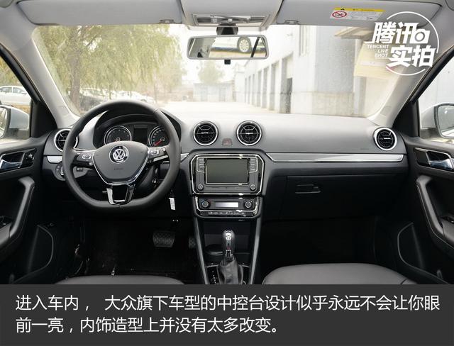 進(jìn)入車內(nèi), 大眾旗下車型的中控臺設(shè)計似乎永遠(yuǎn)不會讓你眼前一亮,內(nèi)飾造型上并沒有太多改變。全新三輻平底方向盤是最大改變,盤輻大小正好,握感也很不錯,鋼琴烤漆的飾條更是點睛之筆,兩側(cè)多功能按鍵可以控制多媒體和藍(lán)牙電話等功能。儀表盤的底紋有所改變,黑底白字清晰易讀,中央是單色行車電腦顯示屏。車內(nèi)空調(diào)出風(fēng)口造型有所調(diào)整,內(nèi)部構(gòu)造更加復(fù)雜。