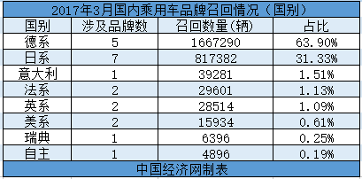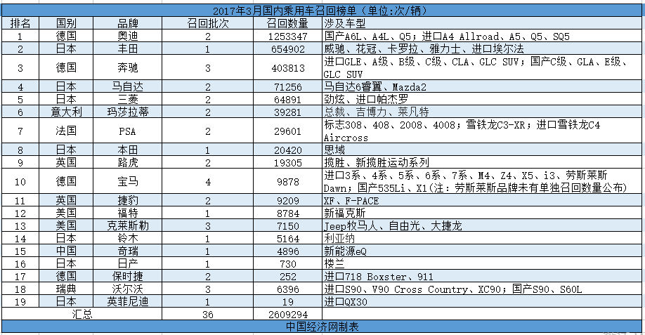根據(jù)國(guó)家質(zhì)檢總局缺陷產(chǎn)品管理中心3月份發(fā)布的召回公告,中國(guó)經(jīng)濟(jì)網(wǎng)汽車頻道經(jīng)過(guò)匯總、統(tǒng)計(jì),整理出“3月國(guó)內(nèi)乘用車召回榜單”。3月份,中國(guó)汽車市場(chǎng)內(nèi)共有21個(gè)汽車品牌發(fā)布了累計(jì)36次召回公告,共計(jì)召回2609294輛汽車。