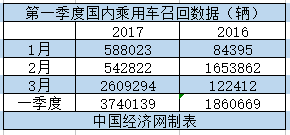 2016年,國(guó)內(nèi)乘用車召回?cái)?shù)量首次突破一千萬(wàn)輛,達(dá)到11331565輛。進(jìn)入2017年,國(guó)內(nèi)乘用車召回?cái)?shù)量繼續(xù)井噴,今年一季度累計(jì)召回汽車3740139輛,同比2016年一季度的1860669輛增長(zhǎng)了101.01%。