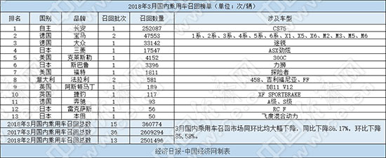 根據(jù)國(guó)家質(zhì)檢總局缺陷產(chǎn)品管理中心3月份發(fā)布的召回公告,經(jīng)濟(jì)日?qǐng)?bào)-中國(guó)經(jīng)濟(jì)網(wǎng)汽車(chē)頻道經(jīng)過(guò)匯總、統(tǒng)計(jì),整理出“2018年3月國(guó)內(nèi)乘用車(chē)召回榜單”。3月,國(guó)內(nèi)乘用車(chē)市場(chǎng)共有13個(gè)品牌發(fā)布15次召回公告,累計(jì)召回汽車(chē)360774輛,召回?cái)?shù)量同環(huán)比均出現(xiàn)大幅下降,其中同比下降86.17%,環(huán)比下降85.58%。