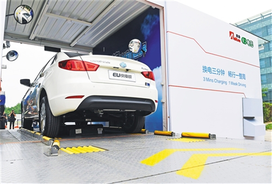 7月5日,北汽新能源首款對(duì)私換電車型在換電站樣板間展示如何快速換電。 新華社記者 羅曉光攝