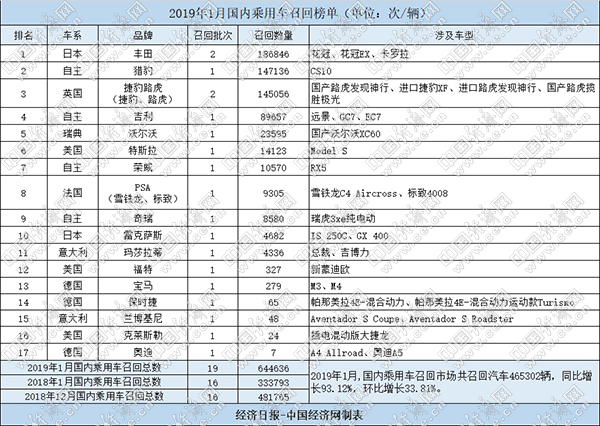 根據(jù)國(guó)家市場(chǎng)監(jiān)督管理總局缺陷產(chǎn)品管理中心1月份發(fā)布的召回公告,經(jīng)濟(jì)日?qǐng)?bào)-中國(guó)經(jīng)濟(jì)網(wǎng)汽車(chē)頻道經(jīng)過(guò)匯總、統(tǒng)計(jì),整理出“2019年1月國(guó)內(nèi)乘用車(chē)召回榜單”。1月,國(guó)內(nèi)乘用車(chē)市場(chǎng)發(fā)布19起召回公告,共涉及19個(gè)品牌的644636輛汽車(chē),同比增長(zhǎng)93.12%,環(huán)比增長(zhǎng)33.81%。