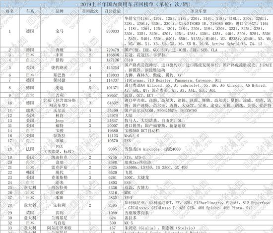 分車系來(lái)看,上半年,德系品牌成為召回“主力”,1-6月,德系品牌共召回汽車1831712輛,占召回總量的66.54%,其中寶馬、奔馳分別以830833輛和720479輛的召回?cái)?shù)量,“遙遙領(lǐng)先”其他品牌;而高檔車、超級(jí)跑車品牌保時(shí)捷更是召回汽車114337輛,數(shù)量甚至遠(yuǎn)超其2018年80108輛的銷量總和。
