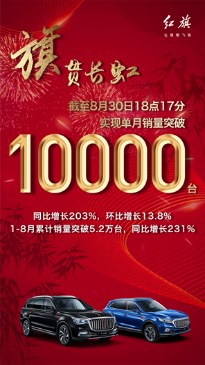 據(jù)紅旗官宣,紅旗品牌單月銷量已突破10000輛,同比增長203%,環(huán)比增長13.8%,至此,1-8月累計(jì)實(shí)現(xiàn)銷量5.2萬輛,同比增長231%。單月突破10000輛的成績,使紅旗首次躋身月銷萬輛俱樂部。