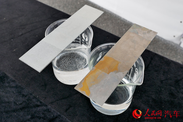 在汽車制造技術(shù)中,車身結(jié)構(gòu)在經(jīng)過焊接成型后,都需要通過電泳池進(jìn)行鍍鋅工藝,以防止車身在日后使用環(huán)境中被腐蝕,最終得到的“白車身”再進(jìn)行漆面噴涂工序。記者看到,實(shí)驗(yàn)人員將不鍍鋅鋼板和經(jīng)過鍍鋅鋼板分別放入8%的鹽酸溶液中,放置20秒左右,取出用水沖洗,然后靜置20分鐘,普通鋼板表面出現(xiàn)明顯紅色銹蝕,鍍鋅鋼板表面無(wú)明顯銹跡。