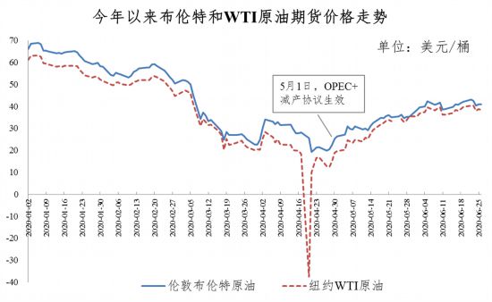 其中,4月20日紐約WTI原油5月合約臨近交割前甚至跌至每桶-37.63美元的負(fù)值。極低油價(jià)給沙特、俄羅斯等主要產(chǎn)油國(guó)帶來(lái)沉重壓力,并促使各方達(dá)成新一輪歷史性最大力度減產(chǎn)協(xié)議。隨著5月OPEC+正式推進(jìn)減產(chǎn),美國(guó)等產(chǎn)油國(guó)在低油價(jià)下產(chǎn)量也出現(xiàn)下降,以及更多海外國(guó)家放寬疫情管制,需求預(yù)期得到改善,國(guó)際油價(jià)逐步回升。目前,倫敦布倫特和紐約WTI油價(jià)升至每桶41美元和39美元的水平。