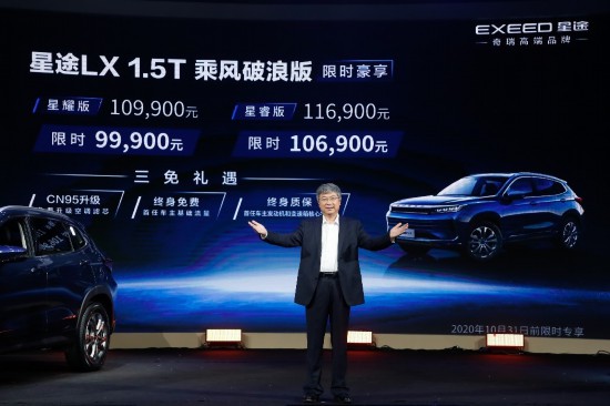 奇瑞汽車股份有限公司黨委書記、董事長尹同躍現(xiàn)場宣布了一項“長期福利”:即日起至10月31日,星途LX 1.5T乘風(fēng)破浪版限時售價9.99萬元起、還可享CN95空濾免費升級、首任車主基礎(chǔ)流量終身免費、首任車主發(fā)動機及變速箱核心零部件終身質(zhì)保“三免禮包”。