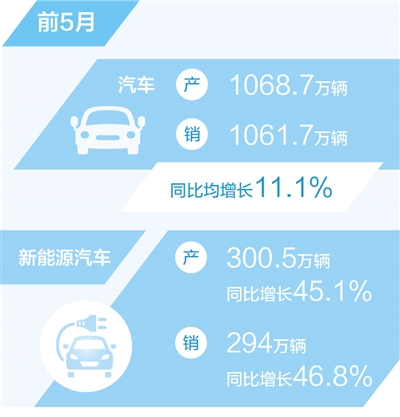 乘用車、商用車產(chǎn)銷同比均較快增長。1—5月,乘用車?yán)塾?jì)完成銷量900.1萬輛,同比增長10.7%。商用車產(chǎn)銷分別完成162.5萬輛和161.6萬輛,同比分別增長14.2%和13.7%。其中,中國品牌乘用車市場份額持續(xù)增長,前5月累計(jì)銷售478.1萬輛,同比增長22.7%,市場份額53.1%,上升5.2個(gè)百分點(diǎn)。
