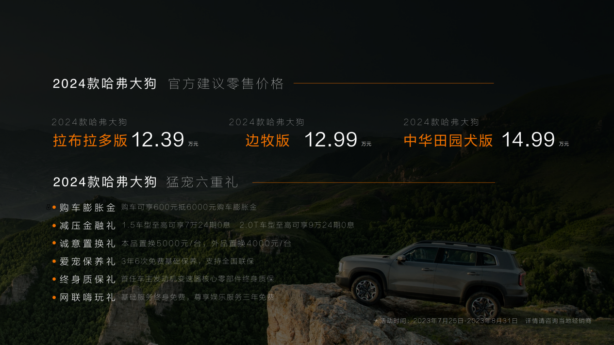 央廣網(wǎng)北京7月26日消息,昨天2024款哈弗大狗正式上市,新車共推出三款車型。2024款哈弗大狗不斷超越自我,在外觀、動(dòng)力、智能等方面的全面進(jìn)階,旨在強(qiáng)勢(shì)接力輕越野引領(lǐng)者的產(chǎn)品使命,在穩(wěn)固輕越野賽道產(chǎn)品地位的同時(shí),不斷征服更為廣闊的市場(chǎng)藍(lán)海。