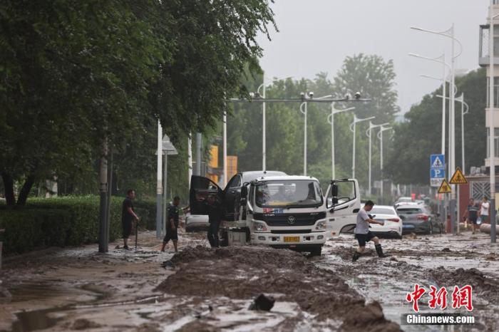8月1日,北京市門頭溝區(qū)橋東街,救援車輛拉走受損汽車。中新社記者 盛佳鵬 攝