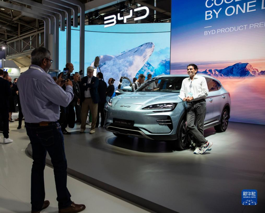 9月4日,在德國(guó)慕尼黑國(guó)際車(chē)展媒體預(yù)展上,參觀(guān)者在比亞迪品牌發(fā)布會(huì)現(xiàn)場(chǎng)與BYD SEAL U汽車(chē)合影。