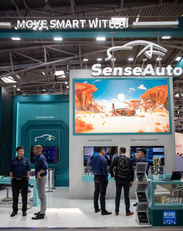 這是9月4日在德國(guó)慕尼黑國(guó)際車(chē)展媒體預(yù)展上拍攝的商湯科技展臺(tái)。