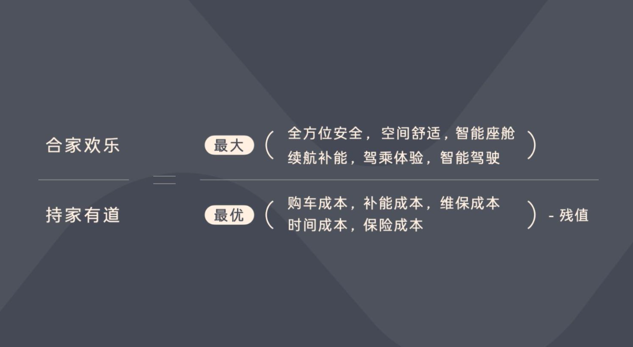 另一點專注放在用戶的核心需求上,這需要產(chǎn)品呈現(xiàn)——話筒交給了他,他用了一個家庭用車價值公式,將產(chǎn)品作為一個分?jǐn)?shù),其中分子體驗價值的最大化,分母是擁車成本的最優(yōu)化。