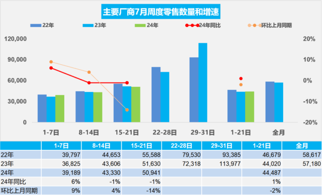 【環(huán)球網(wǎng)科技綜合報道】7月25日消息,乘聯(lián)分會日前發(fā)布了最新的乘用車市場零售數(shù)據(jù)。數(shù)據(jù)顯示,7月1日至21日,乘用車市場零售量為93.4萬輛,同比去年同期微增1%,但較上月同期下降了2%。今年以來,乘用車市場累計零售量已達(dá)1077.4萬輛,同比增長3%。