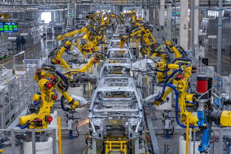 (資料圖片)在位于重慶兩江新區(qū)的賽力斯超級(jí)工廠,焊裝車(chē)間生產(chǎn)線上的機(jī)器人在精準(zhǔn)執(zhí)行作業(yè)指令。新華社記者 黃偉 攝