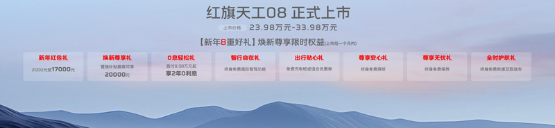 逐夢(mèng)新程,臻享超值。天工08共推出兩驅(qū)和四驅(qū)2種驅(qū)動(dòng)模式共5個(gè)版本供選擇,官方指導(dǎo)價(jià)為23.98萬(wàn)元-33.98萬(wàn)元。同時(shí),購(gòu)買天工08的消費(fèi)者還可尊享“新年8重好禮”限時(shí)權(quán)益,即刻購(gòu)車可享2000元抵17000元的新年紅包禮;置換補(bǔ)貼最高可享20000元的換新尊享禮;首付8.98萬(wàn)元起、享2年0利息的0息輕松禮;終身免費(fèi)高階智駕功能的智行自在禮;免費(fèi)充電樁或組合優(yōu)惠券的出行貼心禮;終身免費(fèi)保修的尊享安心禮;終身免費(fèi)保養(yǎng)的尊享無(wú)憂禮;終身免費(fèi)救援及取送車的全時(shí)護(hù)航禮。從購(gòu)車成本到金融方案,再到智駕裝備、質(zhì)量保障等方方面面,紅旗以超值權(quán)益帶來(lái)進(jìn)階的價(jià)值體驗(yàn),讓用戶買得舒心、用得安心。
