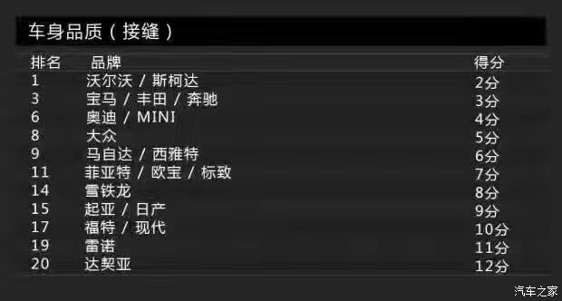Bild調(diào)查的車身品質(zhì)(接縫)主要包括車身品質(zhì)、開關(guān)門的手感、鋼板接縫及經(jīng)常與身體接觸的地方。沒錯,這一單項表現(xiàn)最佳的是沃爾沃,得分為2分。這里小編要敲黑板提醒大家注意了:在車身品質(zhì)(接縫)滿意度上,得分最低表現(xiàn)最好。當然,斯柯達也得到了2分,寶馬、奔馳則同為3分。而得分最高的就是前面提到的達契亞,它的得分是12分,換句話說就是達契亞是車身品質(zhì)滿意度最低的品牌。有意思的是與達契亞一起墊底是法系品牌雷諾,它的得分是11分。