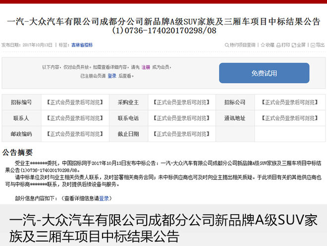 日前,中國招標網(wǎng)正式公布了《一汽-大眾汽車有限公司成都分公司新品牌A級SUV家族及三廂車項目中標結(jié)果公告》從公告上來看,一汽-大眾汽車有限公司正在成都工廠準備新品牌A級SUV兩款車型以及另外一款三廂車項目。該項目主要用于投產(chǎn)一汽-大眾全新經(jīng)濟用車品牌,以滿足消費者對廉價車的購買需求。