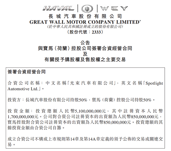 7月10日,長(zhǎng)城、寶馬正式簽署合資經(jīng)營(yíng)合同。兩家公司聯(lián)合出資51億元人民幣,成立注冊(cè)資本為17億元的光束汽車(chē)有限公司,注冊(cè)地為江蘇省張家港市。